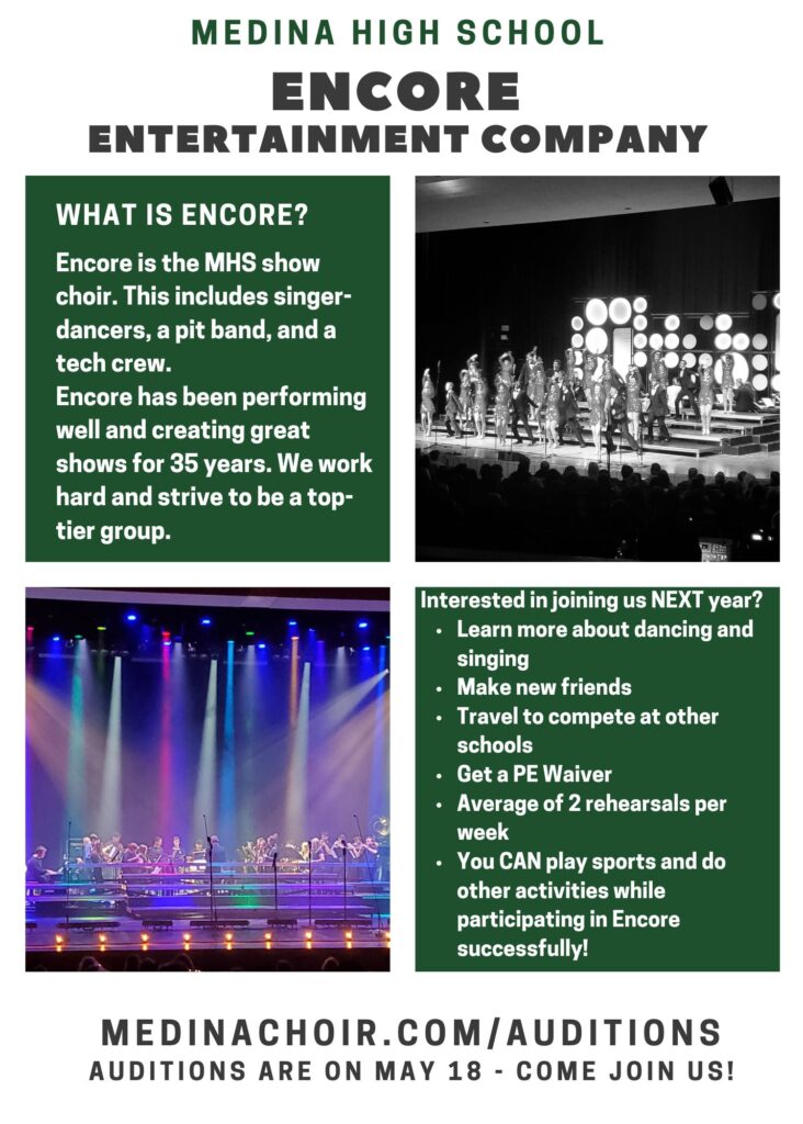 Encore is our competition show choir at Medina High School. Membership in Encore is open to students in grades 9 through 12 with an audition. Singers and pit band members will audition in May of the preceding school year, and crew members will interview in spring/summer of the school year.